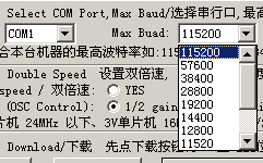选好了器件,选好了文件,第三步就可以设置串口和串口通信速度了。串口是一个九针的插座,老式的鼠标口就是串口。为了让通信可靠,我们可以适当的选低一些的速度,这个串口线较长时非常重要。