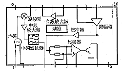 从外接天线接收的信号经C10耦合到L2、C11组成的选频网络进行阻抗变换后输入RX3310的内部高频放大器输入端14脚,经芯片内的高频放大后(增益为15~20DB)的信号再经混频器与本机振荡信号(316.8M)混频,产生1.8M的中频信号,此中频信号经内部中频放大后由第3脚输出,再进入比较器放大整形,最后数据从第8脚输出。