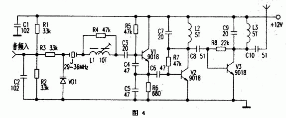图4为晶振式发射机电路。电路中J.、VD1、L1、C3~C5、V1组成晶体振荡电路。由于石英晶体J的频率稳定性好,受温度影响也较小,所以广泛用于无绳电话及AV调制器中。Vl是29~36MHz晶体振荡三极管,发射极输出含有丰富的谐波成分,经V2放大后,在集电极由C7、L2构成谐振于88-108MHz的网络选出3倍频信号(即87~108MHz的信号最强),再经V3放大;L3、C9选频后得到较理想的调频频段信号。频率调制的过程是这样的,音频电压的变化引起VD1极间电容的变化;由于VD1与晶体J串联,晶体的振藩频率也发生微小的变化,经三倍频后,频偏是29-36MHz晶体频偏的3倍。实际应用时,为获得合适的调制度,可选择调制频偏较大的石英晶体或陶瓷振子,也可以采用电路稍复杂的6-12倍频电路。若输入的音频信号较弱;可加上一级电压放大电路。
