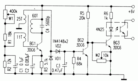 金属不靠近探头时,高频振荡器工作,振荡信号经DV1、DV2倍压整流,得到一直流电压使BG2导通,BG3截止,后续电路不工作。当有金属靠近探头时,由于涡流损耗,高频振荡器停振,BG2截止,BG3得电导通,光电耦合器4N25内藏发光管发光,光敏三极管导通接通电路,起开关作用。