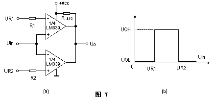 图7电路由两个LM339组成一个窗口比较器。当被比较的信号电压Uin位于门限电压之间时(UR1<Uin<UR2),输出为高电位(UO=UOH)。当Uin不在门限电位范围之间时,(Uin>UR2或Uin<UR1)输出为低电位(UO=UOL),窗口电压ΔU=UR2-UR1。它可用来判断输入信号电位是否位于指定门限电位之间。