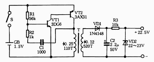 如图所示是一种输出电压可达22.5 V的直流升压器电路,可用来代替22.5 V的叠层电池。