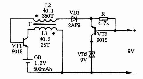电路中变压器T可用晶体管收音机用的502型音频输出变压器,次级作为升压变压器的初级,初级中间的抽头不用,两端抽头作为升压变压器的次级。如果找不到合适的变压器,也可以用收音机输人输出变压器的硅钢片自制,初级用直径为0.25mm的高强度漆包线绕110匝,次级用直径0.21mm的高强度漆包线绕520匝。初次级间要加一层绝缘纸,并注意初次级线圈的同名端。
