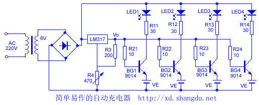本充电器电路简单,元件易取,它对各节镍镉电池分别充电,充足电即自停。电路见附图所示,充电前,先调节R4,使三端可调稳压器LM317的输出电压为预定值Vo,当充电电池的电压Ve上升到Vo-0.65V时,晶体管截止,充电终止,同时相应的充电指示灯LED熄灭.其充电电流由R11-R14所限制。