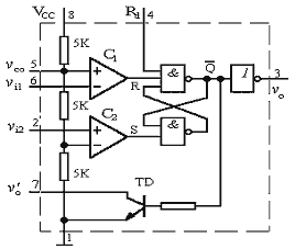 电路分析说明:热敏电阻R4随着温度的升高阻值减小,引起R4和R8之间的电压上升;R1、R2、R3组成分压电路提供参考电压,调节R3可以改变参考电压值;运放LM324构成电压比较器,反向输入参考电压,正向输入信号电压(随温度改变的电压),当信号电压超过参考电压时,输出由低电平翻转成高电平;555定时器产生报警用的音频信号,直接驱动喇叭发声,调节R5、R6、C5的值可以改变音调,由复位端4脚控制是否发声(低电平复位、高电平或悬空时发声);555定时器复位端(4脚)和运放输出端之间用NPN三极管9018隔开,9018基极接水箱上的水位计,有水时A、B两点导通,使得9018基极接电源高电平,三极管导通,LM324输出低电平使555不发声,如果水箱里没水,9018基极由R9接地,截止,555复位脚悬空,喇叭报警,可以防止干烧,温度升高到设定值时,324输出高电平,使得555复位端电平抬高,喇叭发声报警,提醒用户停电,9018在此构成权限控制电路;电源由变压器(VC-9V)通过二极管桥式整流电容滤波后经7805稳压提供5V电压供电。在实际使用时我将热敏电阻贴在水箱外壁上,根据个人爱好调节R3,设定水温。 555内部结构和引脚如图所示