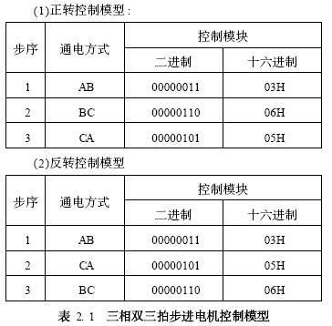 因为三相双三拍步进电机不易失步,控制精度比较高,所以本文对三相双三拍步进电机进行控制,定子有三对磁极,运行时两相同时通电,循环带动转子转动。