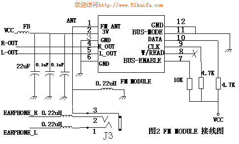 作为电子产品的设计,除了选择合适的芯片,还要根据产品的功能定义,合适的选用和实现芯片的功能,这就需要通过适当的外围电路来完成。作者也是在基于博源电子的FM Module的基础上在便携式视频播放器PVP(portable video player)上实现无线电广播的实时播放和节目的数字转录的。如图2即为基于图1的FM Module在PVP中的应用连接,其中FM Module的12个脚就是图1的CN1、CN2中的引脚及FM_ANT引脚整合而成的,图中VCC接PVP系统中的3.3V的电源,并通过磁珠及电容器件进行干扰抑制,注意磁珠FB(Ferrite Bead)应选用特征频率为100MHz、直流电阻低的贴片器件,这样有利于对高频噪声进行抑制但同时又不使系统产生过多的直流损耗。22uF的电容最好选用钽电容,两个0.1uF的电容可以选用介电常数高、高频性能好的陶瓷电容,这样就保证了整个FM Module的电源系统的稳定。其中R_OUT、L_OUT为FM的音频信号输出,对于音频信号的特性作者下文将要详述。BUS-MODE是用来选择CPU与FM Module串口通信的方式,本系统把BUS-MODE拉到地选择为I2C的通信方式。DATA和CLK即为I2C通信的数据线和时钟线,系统的CPU通过I2C接口即可对FM Module进行控制。W/READ在本系统没有使用,其只有在BUS-MODE为逻辑高电平时才有效,此时FM Module通过W/READ、CLK、DATA与系统的CPU实现三线方式串行通信。BUS-ENABLE为总线使能信号,当BUS-ENABLE为逻辑低时FM Module进入省电模式,本系统中把其直接拉高,是因为FM Module可以通过I2C接口控制其进入省电模式。FM_ANT为FM Module的天线接口即射频信号输入脚,目前在此类消费电子产品中,天线大多采用耳机线代替,本产品也不例外,图2中的J3即为立体声耳机接口,耳机左右声道信号线上感应到的毫伏级的FM信号即可通过J3的脚3进入到FM Module中。当然这么小的信号不会对耳机上的音质有什么影响,而且由于有如图2中的三个0.22uH空心电感的隔离作用,FM的信号可以损耗很小的被FM Module接收。值得注意的是三个空心电感应该在电路板上紧靠耳机接口放置以增加接收的灵敏度,并且电感的直流阻抗应当尽量小些,这样可以减少音频的功率损耗。三个电感选用考虑到空心结构可能外形尺寸比较大,不太适合于便携式产品的应用,也可选用陶瓷支架的电感。尽量不要选用非线性比较大的铁氧体支架电感,这有可能影响耳机的音质。当然,FM信号的接收是一个精细的工作,每个产品的设计、材质选用、功能模块的串扰都各不相同,设计者可以在本文的基础上相应的根据自己产品的特点细调各元器件的相关参数。