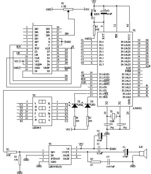 用可调电阻调节电压值作为模拟温度的输入量,当温度低于30℃时,发出长嘀报警声和光报警,当温度高于60℃时,发出短嘀报警声和光报警。测量的温度范围在0-99℃。