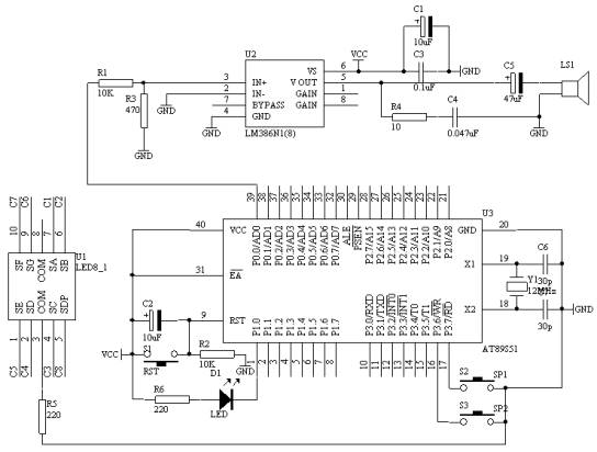 根据设定好的密码,采用二个按键实现密码的输入功能,当密码输入正确之后,锁就打开,如果输入的三次的密码不正确,就锁定按键3秒钟,同时发现报警声,直到没有按键按下3种后,才打开按键锁定功能;否则在3秒钟内仍有按键按下,就重新锁定按键3秒时间并报警。
