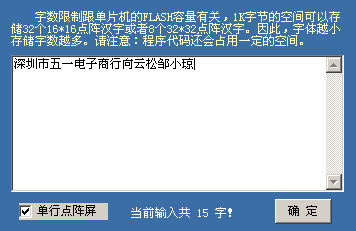本软件对文本内容实现分段编辑管理,您点击相应的段,就可以在文字预览查看该段文字内容,您再点击文字预览内容,就可以打对文字进行编辑。如上图,输入文字自动统计文字数量,89c51最多大约可以输入100字左右。经验:建议在文字最后来输入一些空格,这样,文字滚动开头和结尾交接就会非常自然!