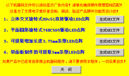 本软件除了可以手动编辑LED亮灭状态以外,还可以利用文字和图片来自动生成代码,并且可以生成供单片机直接使用的HEX机器码文件!大家可以方便的用本软件来自动生成自己内容的HEX机器码文件,目前已经支持四种LED点阵。