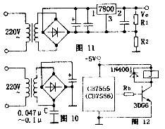 (2)控制调制交流声 电源变压器的次级线圈不仅能引进50Hz的交流电能,而且能从电网中引进各种高频的无线电波和其它干扰。在用作收音机或随身听稳压电源时,会出现令人讨厌的调制交流哼声。有些简易电源变压器初、次级线圈不有屏蔽层,为了抑制交流声可在变压器次级线圈对地接一只0.047~0.1μF的电容器,如图10所示。