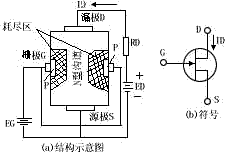 (1)结构原理 它的结构及符号见图1。在N型硅棒两端引出漏极D和源极S两个电极,又在硅棒的两侧各做一个P区,形成两个PN结。在P区引出电极并连接起来,称为栅极Go这样就构成了N型沟道的场效应管