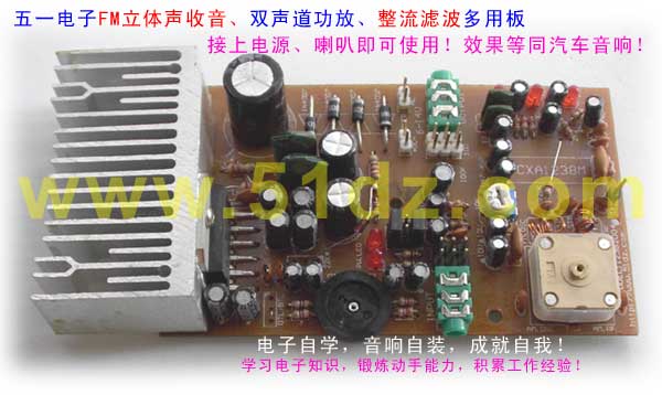 本板不增加任何其它电路板和其它元件就可以做成一个无线接收广播、无线喊话器、FM收音机、高保真双声道功率放大器。
