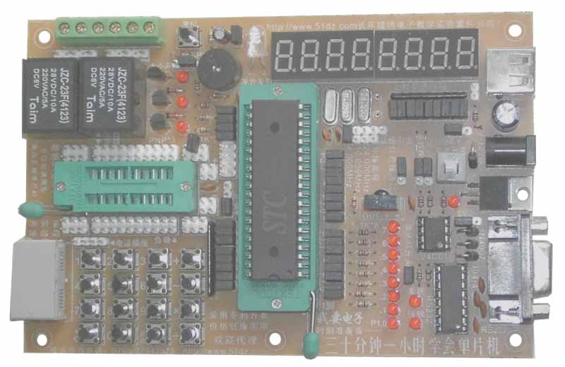 51单片机编程下载实验学习仿真开发一体板,仍然采用单面板设计,不过,我们认为,学习技术不是穿和吃,穿一定要穿好的,五百一千无所谓,这样才做足面子;吃一定要吃好的,五十一百没关系,这样才健康卫生;买单片机只不过是为了学习技术而已,没有必要浪费这个钱,一两百、两三百都可以,没有必要和别人比。再说,本站单片机是用的单面线路板,不论在使用还是维修、维护、还是自由发挥方面,都非常有益。本站有很多客户,都是以前买过别人双面板的单片机,又来购买本站的单片机,他们就是这样说的,双面板看线路好难,搞到最后还是云里雾里,本以为用个几个月后就会越记越熟了,但谁知隔了一两个月全忘记了,拿着板看来看去就象看个“黑匣子”,单面板就方便多了,随时随地正面反面一看,哪里连到哪里,一目了然,电路原理图基本上就是多余的,他们班上有好几个同学宁可弃以前高价购买的双面板单片机不用,也专程来购买了五一电子的单面板单片机。当然,本站知道,他们为什么放弃他们已有的单片机不用还要来购买本站单片机,还有的原因就是因为本站的单片机操作确实是更简单,使用确实是更方便,无需编程器也无需下载线,特别是产品开发时,可以立即下载到芯片立即看到运行结果,非常方便!