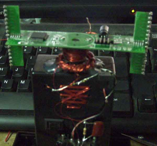 这是正在转动时的效果。本制作采用一个玩具上的劣质电机,用线将电机捆在盒子上固定,采用无线输电技术,将电源无线连接送给转动的LED板上让LED显示发光。所谓的无线输电技术,就是没有接点供电,利用电磁转换原理,大家可以看出我手工绕制的线圈非常的简陋。