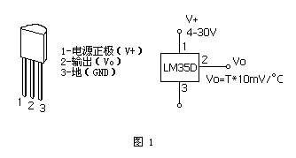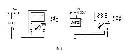 该温度传感器最大的特点是是使用时无需外围元件,也无需调试和较正(标定),只要外接一个1V的表头(如指针式或数字式的万用表),就成为一个测温仪(见图2)。