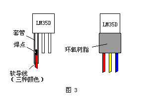 按图3做一个测温头。用200mm长的软导线(3种颜色)分别焊三个引脚,外用双组份环氧树脂固定(这样可以测液体温度)。