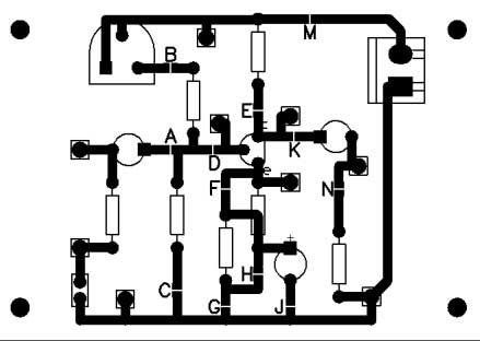 按照电路原理图和元器件清单表在电路板上焊接所用的元器件。元器件焊完后,按照图1-2(电路板示意图)将电路板上的断口A、B、C、D、E、F、G、J、M、K点用焊锡焊连;注意H点不能连接。