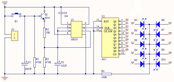 本电路主要由脉冲产生器和一个十进制计数器CD4017电路组成。脉冲产生器由NE555及外围元件构成多谐振荡器,当按下按键K1时Q1导通,NE555的3脚输出脉冲,则CD4017的10个输出端轮流输出高电平驱动10只LED轮流发光。松开按键后,由于有电容C1的存在,Q1不会立即截止,随着C1两端电压的下降,Q1的导通程序逐渐减弱,3脚输出脉冲的频率变慢,LED移动频率也随之变慢。最后当C1放电结束后。Q1截止,NE555的3脚不再输出脉冲,LED停止移动。一次“开奖”过程就这样完成了。C2决定LED移动速度,C1决定等待“开奖”的时间。供电电压4.5V-5V。