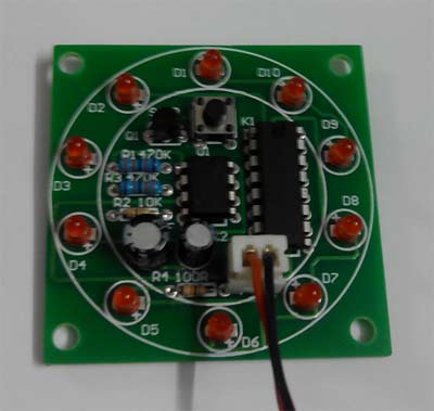 简介: 电子模拟幸运物,当按下启动键1秒以上,发光二极管高速循环流水点亮,几秒钟后旋转速度越来越慢并最终随机停止于某颗灯上。可以将每颗灯旁边标上幸运物品作为摇奖器。C1的数值决定延迟时间,C2的数值决定循环速度。