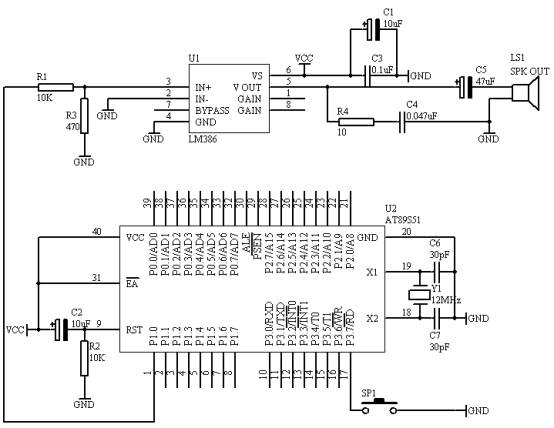 当按下开关SP1,AT89S51单片机产生“叮咚”声从P1.0端口输出到LM386,经过放大之后送入喇叭。