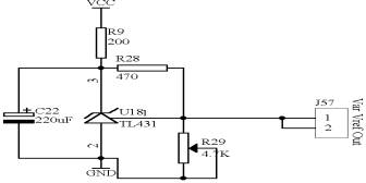 在系统板上写有“参考电压源”区域中,是由TL431来完成参考电压的调节,调节范围在0-2.50V之间;主要为是系统板上需要参考电压芯片或是为外部设备提供参考电压,由Var