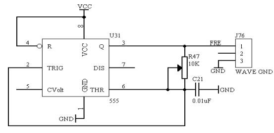 该模块采用555芯片产生一些连续频率的方波信号,由“WAVE GND”端口输出,其稳定可调的频率范围在5KHz-100KHz之间变化。电路原理图如图1.7所示: