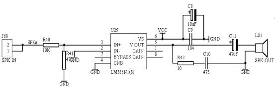 该音频放大模块采用LM386芯片作为音频的功率放大,音频信号由“SPK IN”端口输入,信号的输出由“SPK OUT”端口输出,只要在“SPK OUT”接一个喇叭即可。具体的电路原理图如图1.8所示:
