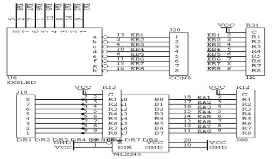 该系统板上提供了8X8点阵模块,用于理解单片机是如何控制点阵数码管的工作过程,它有两个输入控制端口,对于点阵数码管有行和列之分,这两个端口分别控制它们的行和列,“DR1-DR8”为8X8点阵模块的行信号控制端口,“DC1-DC8”为8X8点阵模块的列信号控制端口。具体的电路原理图如图1.12所示: