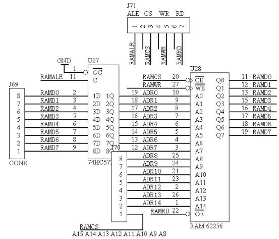 为了适应大容量的数据处理的需要,在系统板上加入了32KB数据存储器(RAM),数据总线从“D0-D7”的端口输入,高8位地址总线从“A8-A15”端口输入,控制数据存储器的读写控制信号从“ALE CS WR RD”端口输入,具体的电路原理图如图1.24所示: